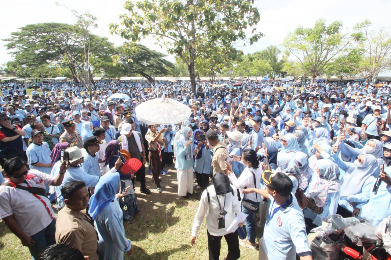 Suasana meriah ribuan guru yang memadati lokasi Puncak Peringatan HUT ke-80 PGRI dan HGN 2025 Kabupaten Serang. Antusiasme terlihat sejak rombongan Bupati Serang tiba di area acara.| Dok. Diskominfosatik Kab. Serang